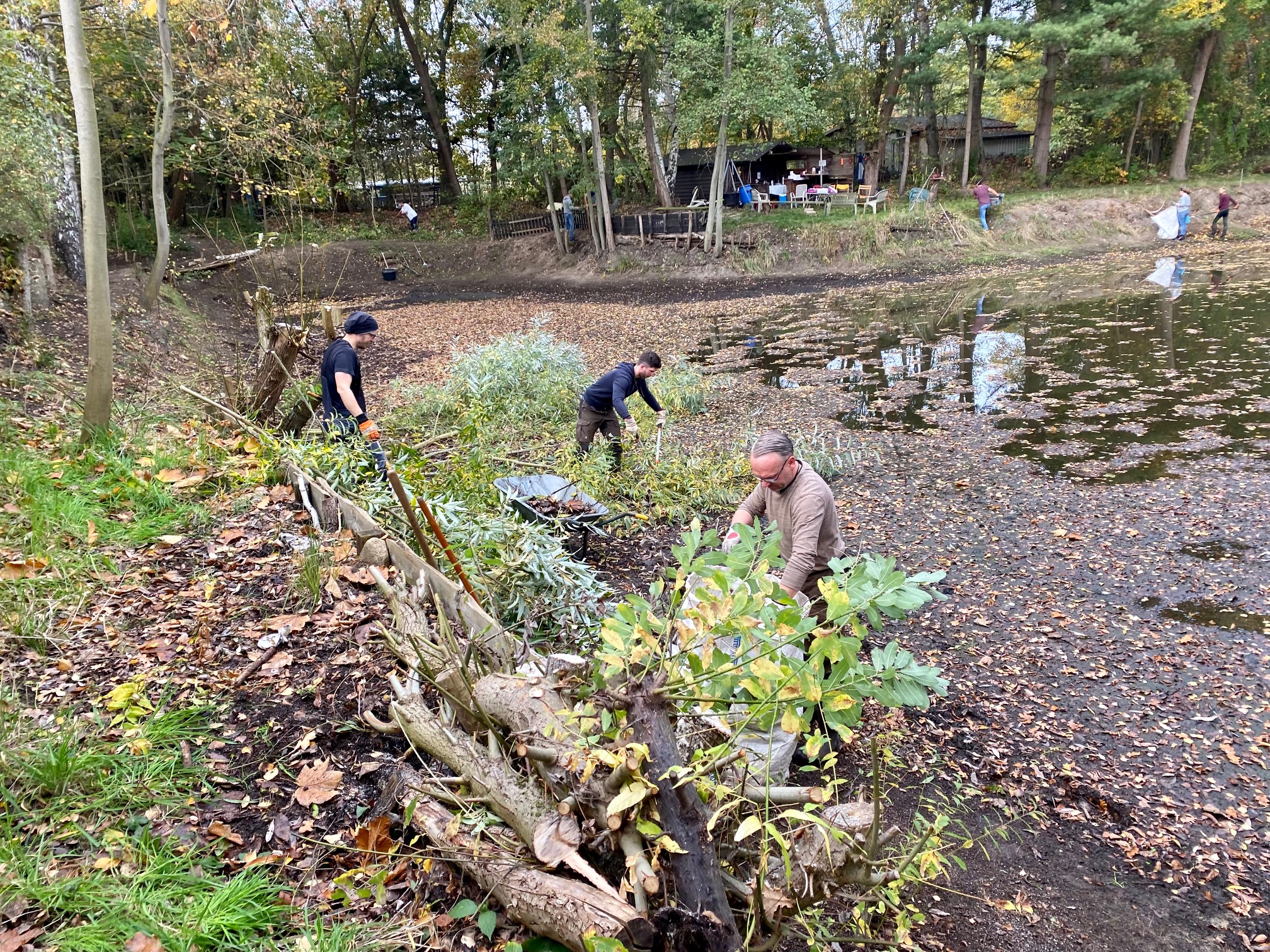 Viele Helfer haben unser Teichgelände in Meine winterfest gemacht und für das nächste Jahr vorbereitet. Sie haben Laub geharkt, sind tief in den Schlamm gestiegen, was der niedrige Wasserstand möglich machte, um Schilf zu pflanzen, haben Bäume und Sträucher beschnitten sowie ein Gatter und eine Sitzbank errichtet.
